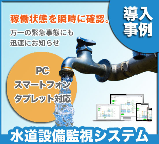 水道設備の状況をモニタリングシステムで、簡単運用・リアルタイムモニタリングが可能!スマホやタブレットでも閲覧可能です!