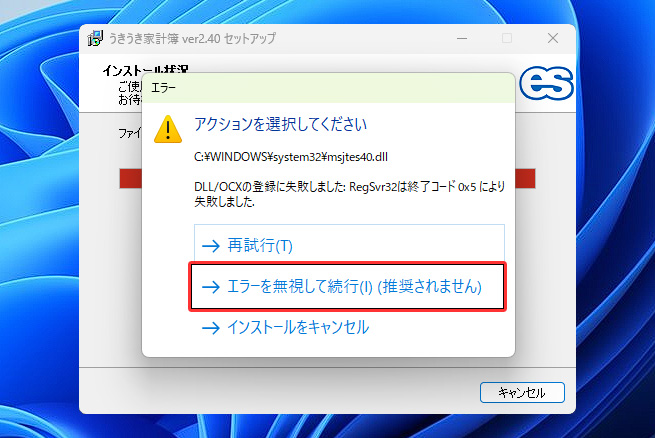 2025年9月以降、うきうき家計簿 フリーソフト版のインストール時に、msjtes40.dllの「DLL/OCXの登録に失敗しました」とエラーが表示されます。
